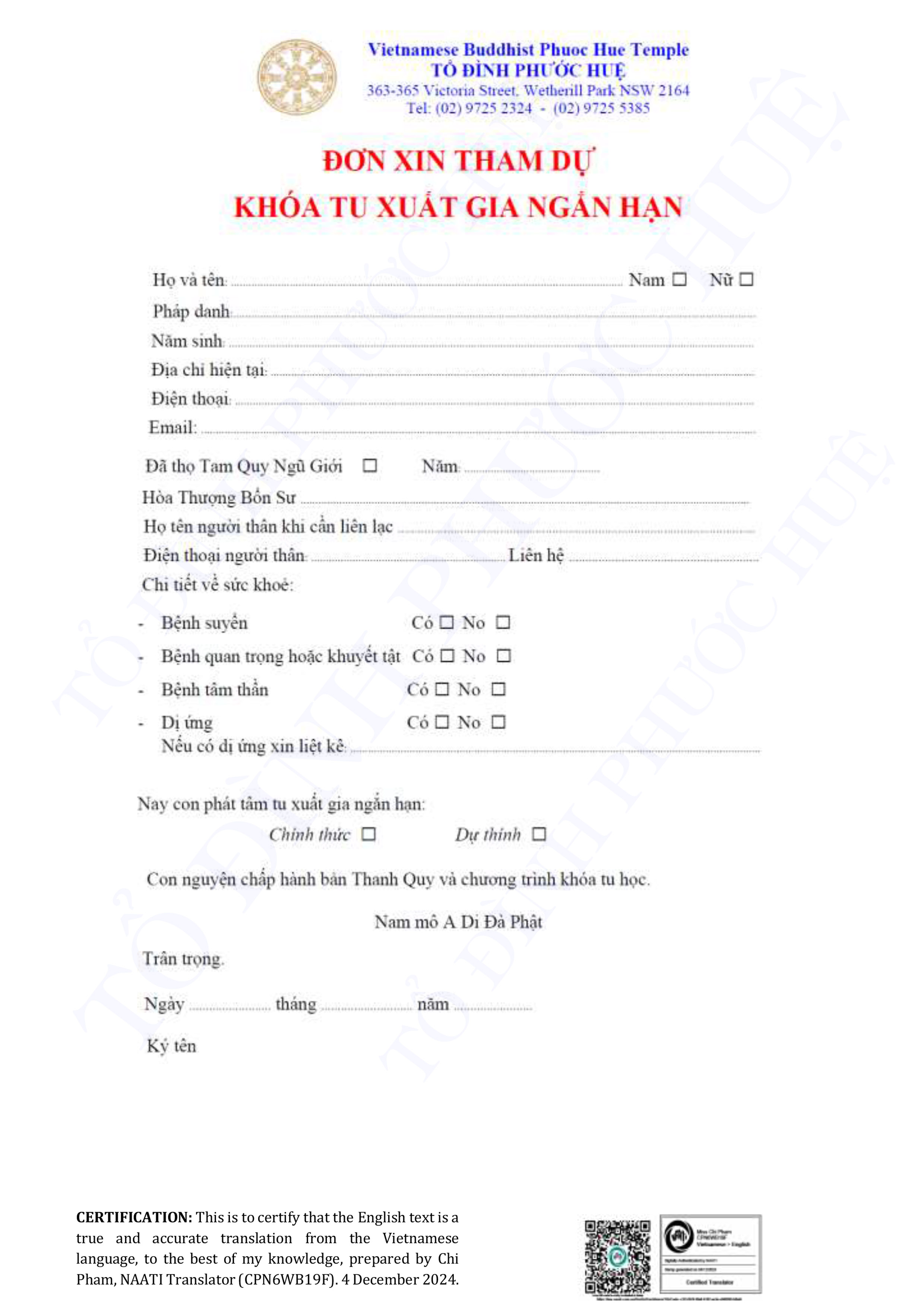 Phone: (02) 9725 2324, Fax: (02) 9725 5385, Email: phuochue@phuochue.org
