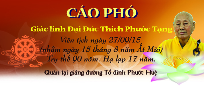 - Thay mặt toàn thể tang môn hiếu quyến, chúng con thành tâm bái thỉnh Chư Tôn Đức Tăng Ni, quý Phật tử, quý bác, anh chị em, bạn bè thân hữu vì tình Linh Sơn cốt nhục, hoan hỷ chấn tích quang lâm về Tổ đình Phước Huệ, số 365 Victoria St. Wetherill Park NSW 2164, điện thoại 02 9725 2324, để trợ tiến Giác linh Đại Đức Thích Phước Tạng cao đăng Phật quốc.